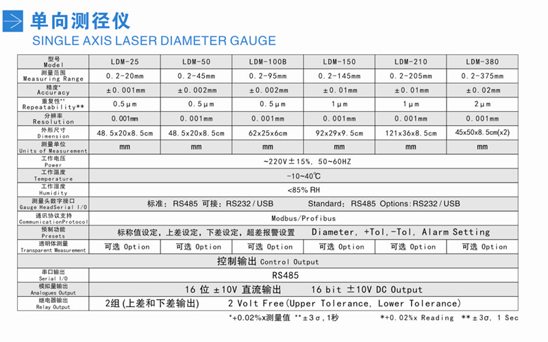 LDM100B/LDM150外徑測控裝置(大直徑激光測徑儀)是采用激光掃描原理進(jìn)行非接觸在線(xiàn)測量的高精度測控裝置,主要應用于各種電線(xiàn)、電纜、管材的生產(chǎn)線(xiàn)中,對外徑進(jìn)行測量并調節擠出機螺桿速度或牽引機速度,達到控制外徑的目的。也可應用于加工工件的外徑和尺寸測量。配以輔助裝置可用于各種回轉體的錐度、圓度、軸向跳動(dòng)等的測量。